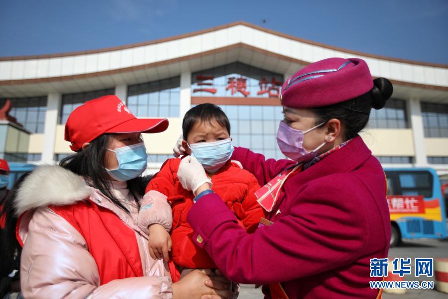 2月20日,工作人员在三穗站外为务工人员子女戴好口罩。