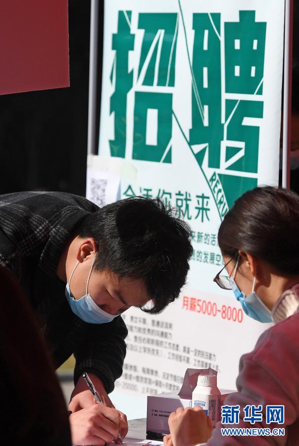 2月20日,求职者(左)在招聘会上填写个人信息。