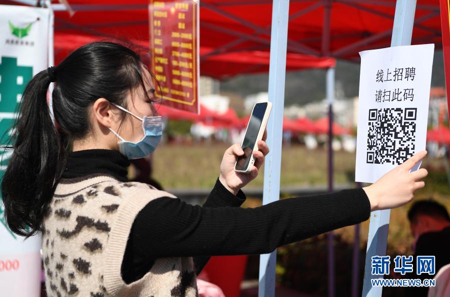 2月20日,求职者在扫描线上招聘信息的二维码。