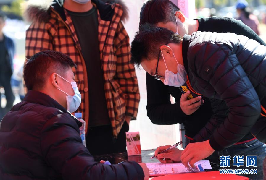 2月20日,求职者(右一)在招聘会上填写个人信息。