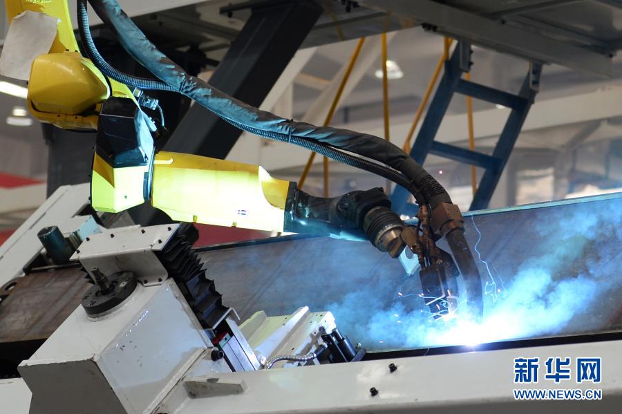 2月20日,在三一重起驾驶室及操作室项目内,车架外焊焊接机器人在作业。新华社记者 陈振海 摄