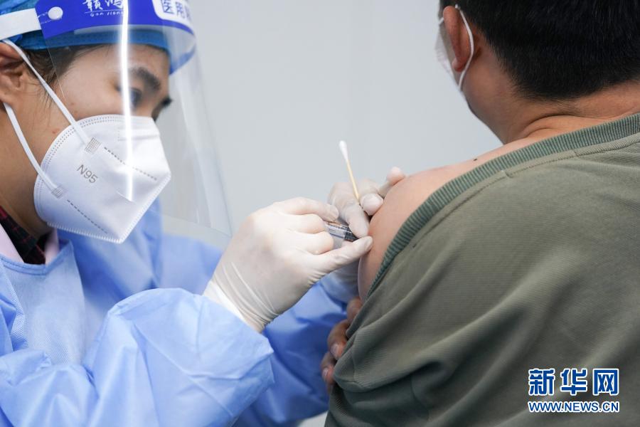 2月20日,在北京市大兴区瀛海镇一处疫苗接种点,医护人员为接种人员接种新冠疫苗。