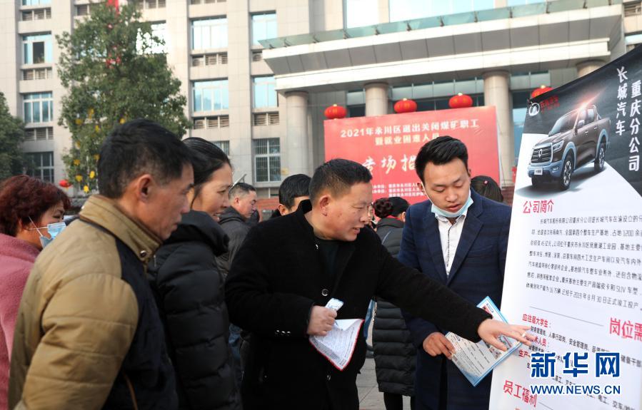 2月20日,求职人员在2021年重庆市永川区退出关闭煤矿职工暨就业困难人员专场招聘会上了解招聘企业情况。新华社发(陈仕川 摄)