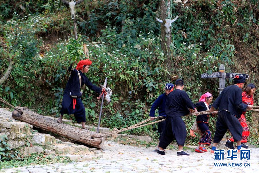 翁丁村村民为游客展示佤族传统民俗拉木鼓活动(2018年3月22日摄)。新华社记者 唐颢宸 摄