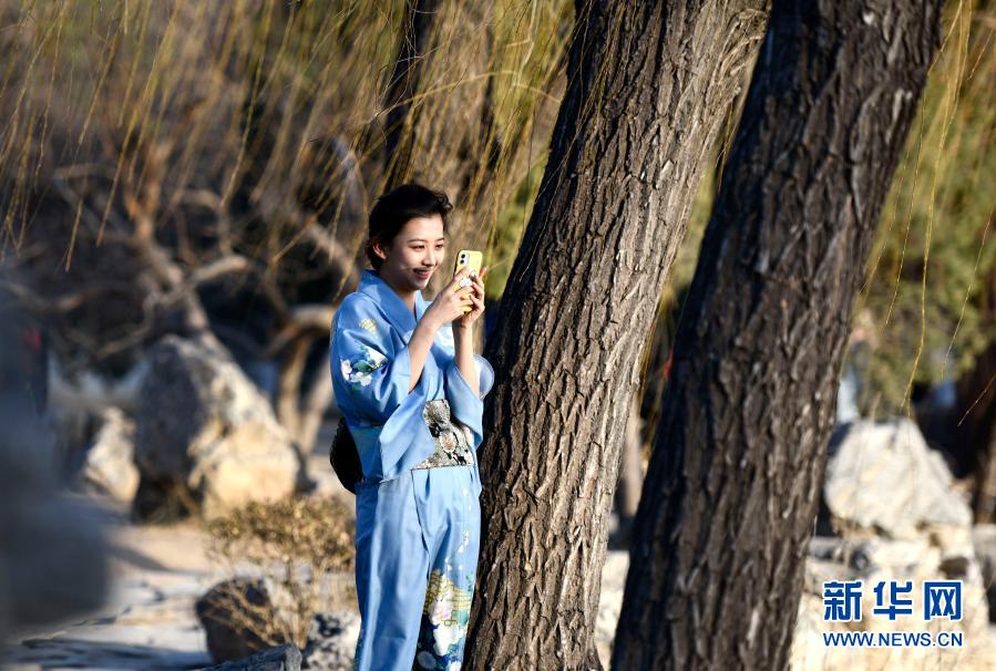 2月20日,游客在天津市水上公园内拍照。新华社记者 赵子硕 摄