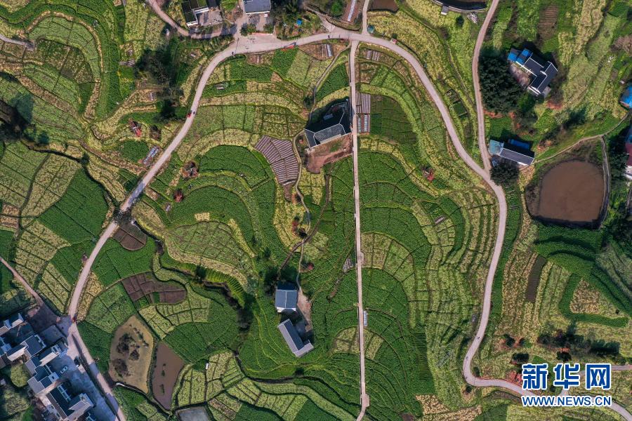 这是在重庆市涪陵区江北街道拍摄的青菜头田地(2月20日摄,无人机照片)。新华社记者 刘潺 摄