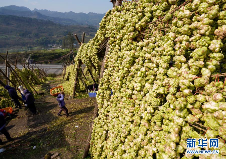 2月20日,在重庆市涪陵区马武镇一家榨菜企业的晾晒场上,成串的青菜头在进行晾晒。新华社记者 刘潺 摄