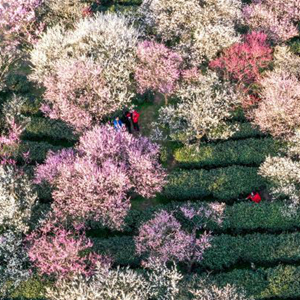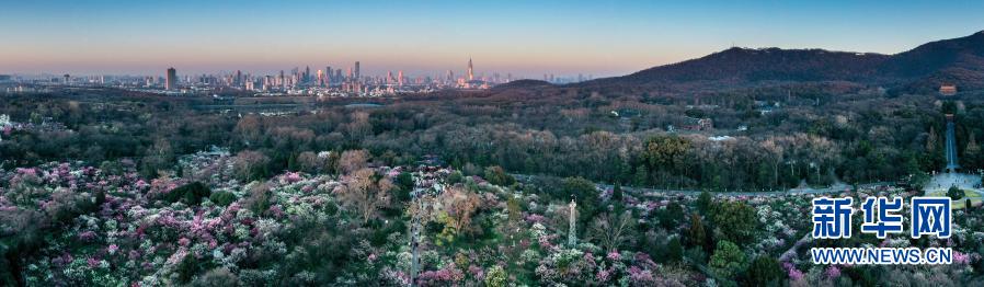 近日,南京梅花山梅花花期正盛,吸引游客前来赏梅看花,眺望南京主城。