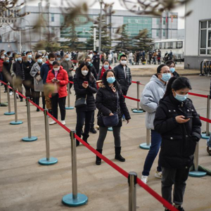 2月21日,在大兴区亦庄镇一处疫苗接种点,居民在排队等候进入接种区。