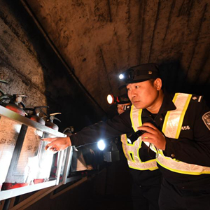 李彬(右)和辅警潘永新在米花岭隧道内巡逻时,躲进避风洞避让驶过的列车(2月20日摄)。新华社记者 陆波岸 摄