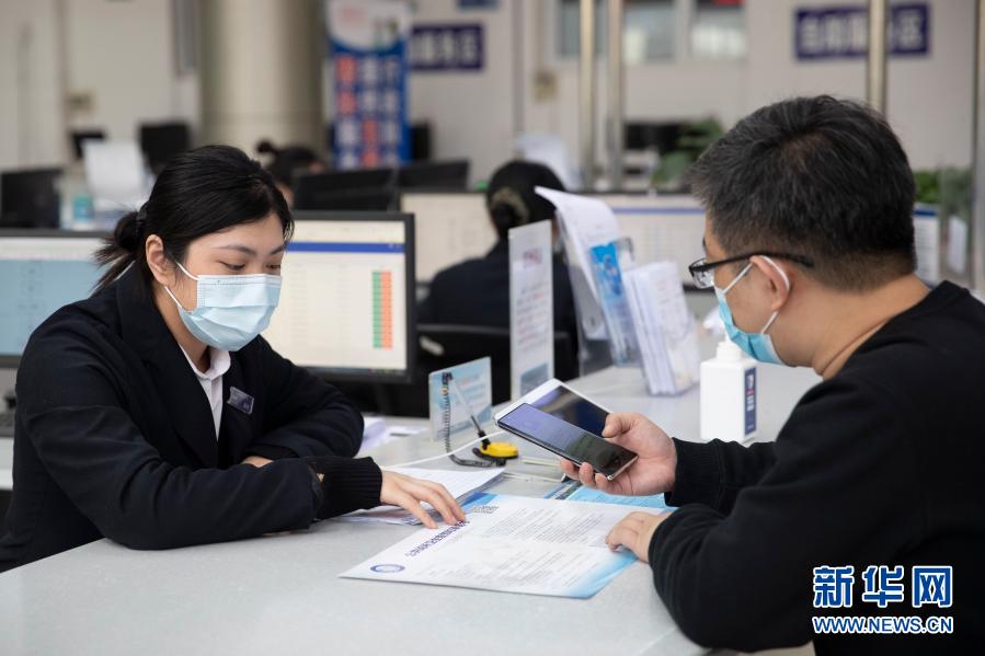 2月19日,在哈尔滨新区管理委员会行政审批局行政服务中心内,工作人员指导申请人通过手机申报。新华社发(张涛 摄)