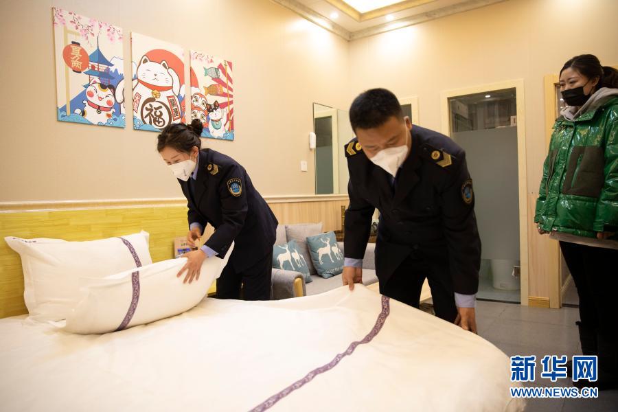 2月19日,在哈尔滨新区一家小型宾馆内,松北区卫健局的工作人员进行现场查审。新华社发(张涛 摄)