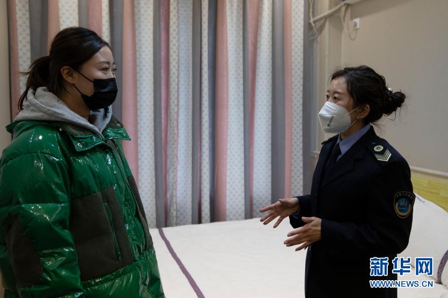 2月19日,在哈尔滨新区一家小型宾馆内,松北区卫健局的工作人员为店主讲解卫生消杀的注意事项。新华社发(张涛 摄)