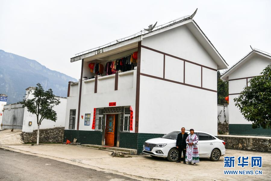 2月20日,在化屋村麻窝寨易地扶贫搬迁集中安置点,苗族村民杨军与妻子杨红仙在自家新房和新车前合影。杨军和妻子常年在浙江的圆珠笔厂务工,春节后他们想继续外出务工,挣到本钱回家好发展其他产业。