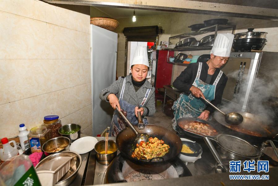 2月20日,化屋村苗族村民何兰与丈夫杨长富在给客人做菜。2018年,何兰和丈夫看准村里的旅游市场前景,创办了化屋村画廊苗家农庄。她希望新年通过自家的示范带头,带动更多村民开办农家乐,一起增收致富。