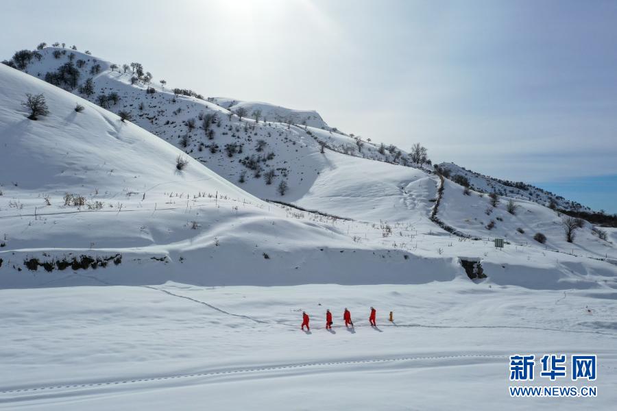 管道巡护人员在西气东输二线果子沟段巡检(2月4日摄,无人机照片)。