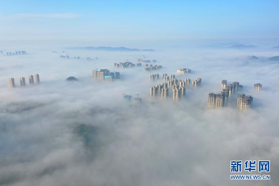 2月14日,贵阳市观山湖区楼宇笼罩在雾气中。
