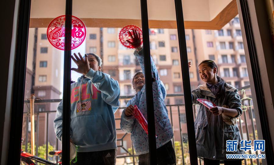 石元顺的女儿们在贴窗花(2月11日摄)。