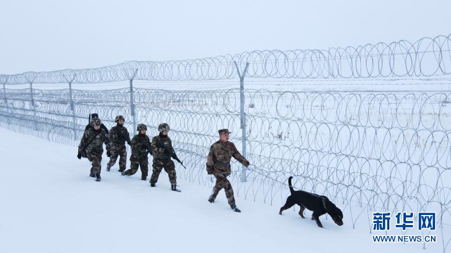2月11日,武警兵团总队执勤第五支队官兵在塔城地区中哈边境某段与当地公安、民兵踏雪巡逻(无人机照片)。