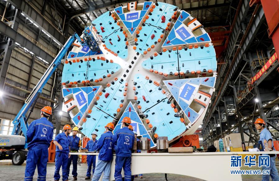 2020年10月15日,工人在由隧道股份上海隧道工程有限公司自主研发制造的超大直径盾构机“骐跃”旁讨论交流。新华社记者 方喆 摄