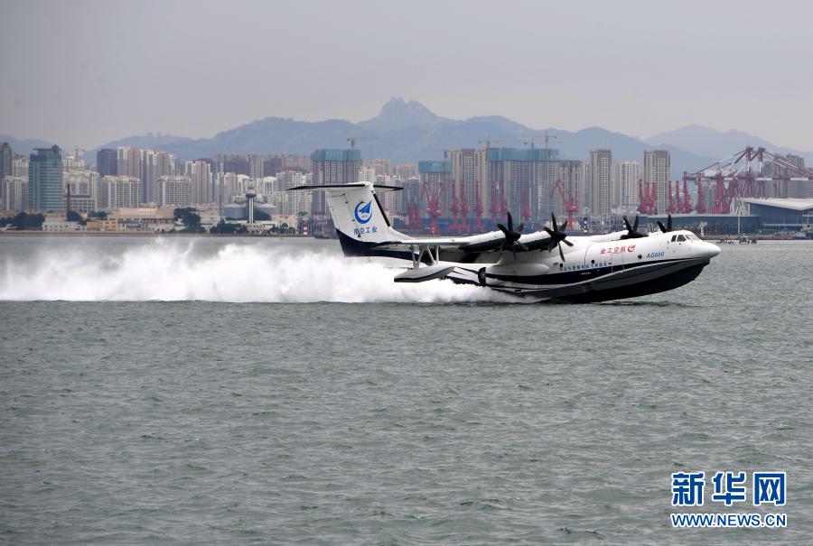 2020年7月26日,国产大型水陆两栖飞机“鲲龙”AG600在山东青岛团岛附近海域成功实现海上首飞。新华社记者 李紫恒 摄