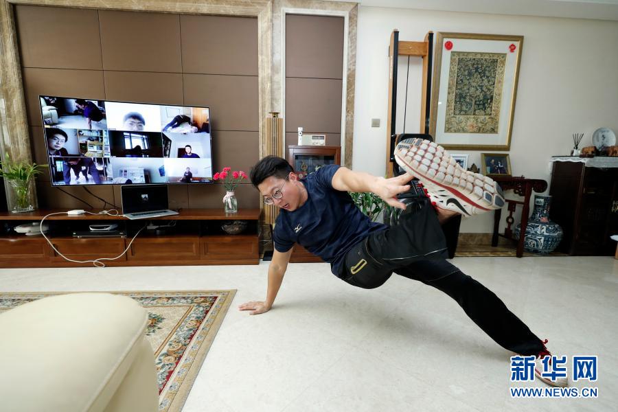2020年2月17日,清华大学体育部教师胡孝乾在北京家中为大二学生远程在线上体育课(棒球专项)时示范如何做侧面卷腹训练。新华社记者 沈伯韩 摄