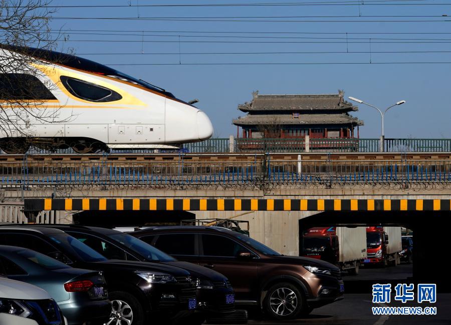 2019年1月25日,一列复兴号动车组列车在北京永定门城楼附近的京津城际铁路上行驶。新华社记者 邢广利 摄
