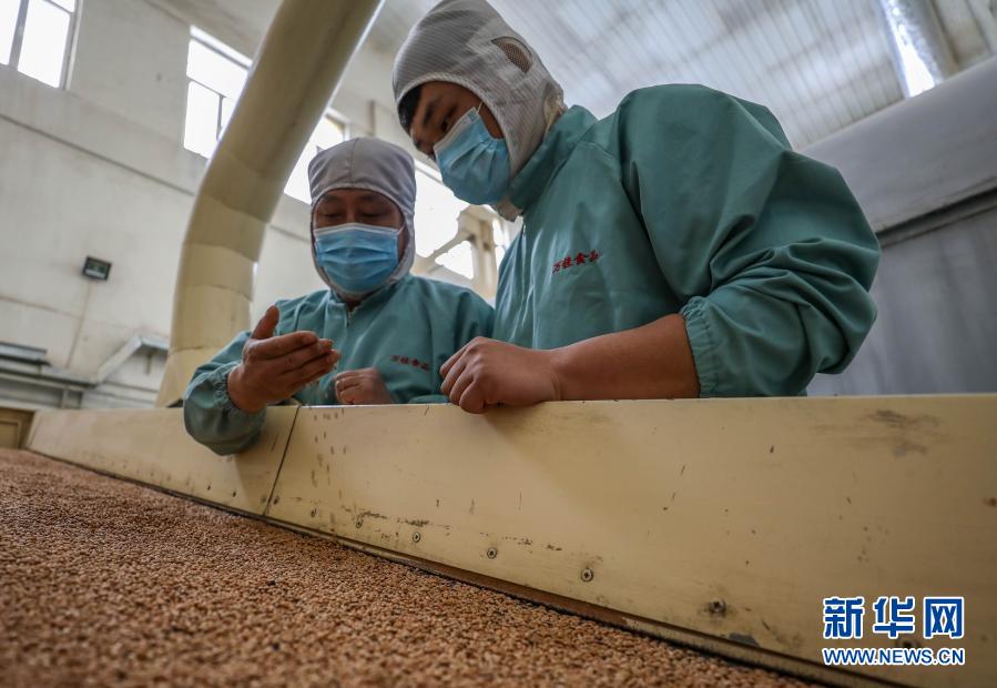 2月21日,内蒙古科沁万佳食品有限公司的工人在制酱车间内检查原料品质。新华社记者 彭源 摄