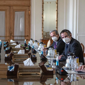 2月21日,在伊朗德黑兰,伊朗外交部长扎里夫(左一)和国际原子能机构总干事格罗西(右一)举行会谈。