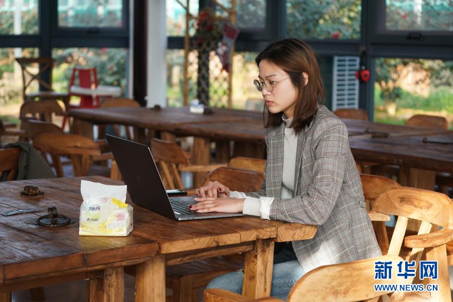 谢丞恩在网络上推广红标鸡(2月20日摄)。新华社记者 季春鹏 摄