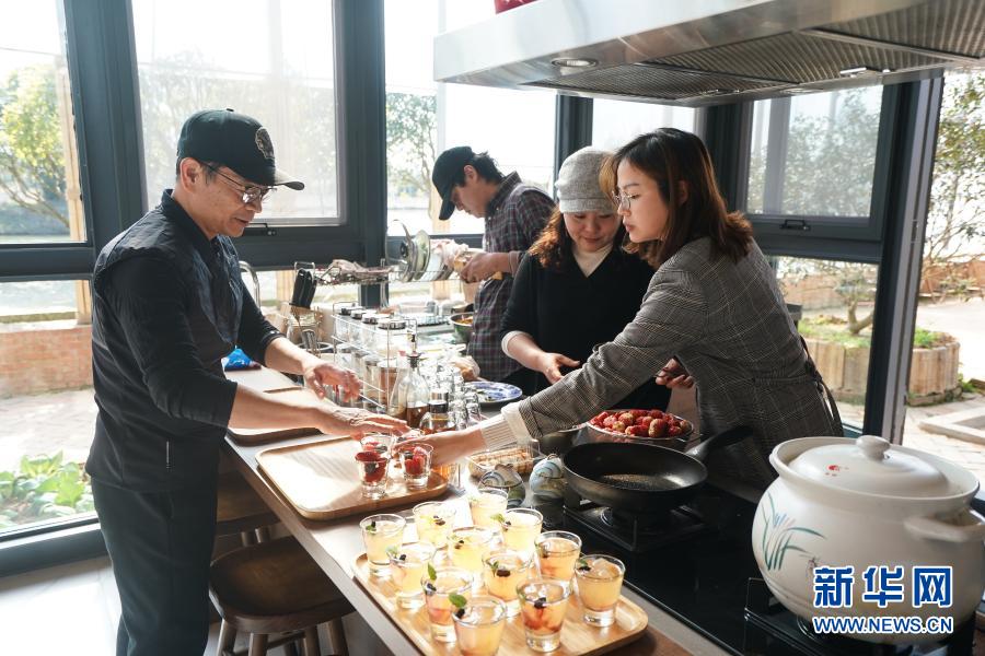 谢丞恩(右一)和父母以及二哥谢丞皓(右三)在农场内给参观的客人准备美食(2月20日摄)。新华社记者 季春鹏 摄