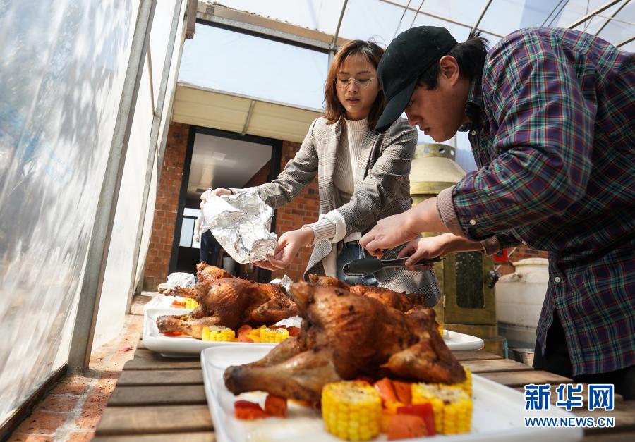 谢丞恩(左)和二哥谢丞皓在农场内给参观的客人准备烤鸡(2月20日摄)。新华社记者 季春鹏 摄