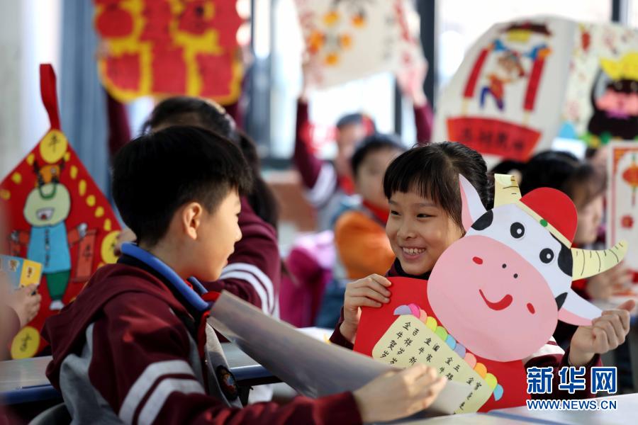 2月22日,在安徽省合肥市和平小学,孩子们互赠自制的新年礼物。当日,安徽省合肥市中小学迎来开学,不少学校组织了形式多样的活动欢迎同学们返校。新华社发(解琛 摄)