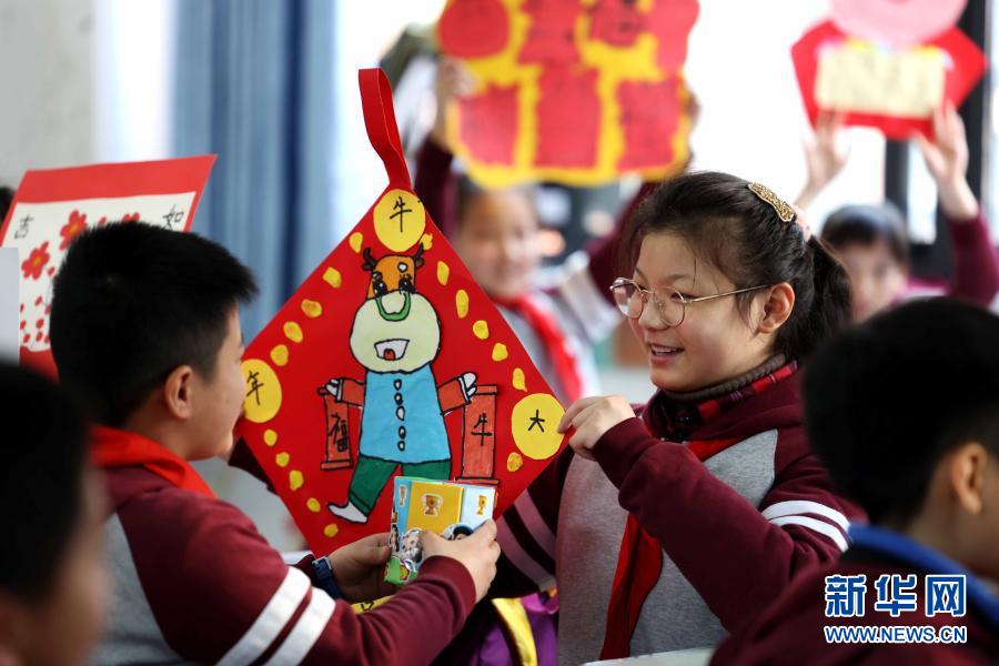 2月22日,在安徽省合肥市和平小学,孩子们互赠自制的新年礼物。当日,安徽省合肥市中小学迎来开学,不少学校组织了形式多样的活动欢迎同学们返校。新华社发(解琛 摄)