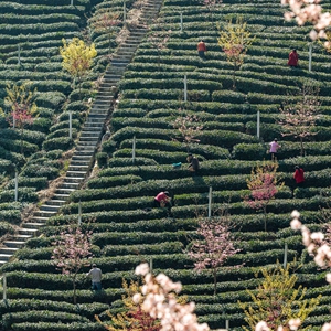2月22日,湖北省宜昌市秭归县九畹溪镇界垭村村民在茶园采摘新茶。近日,三峡库区气温持续回升,茶山春花烂漫、茶树吐绿。湖北省宜昌市秭归县组织茶农抢采今年首批春茶,供应市场。新华社发(郑家裕 摄)