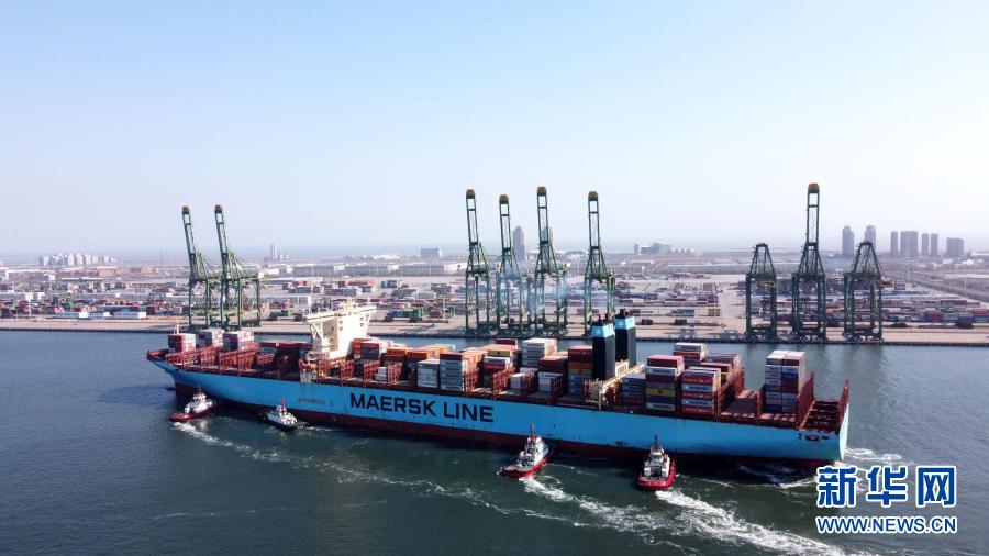 2月22日,一艘载有集装箱的货轮驶入天津港码头(无人机照片)。新华社记者 赵子硕 摄