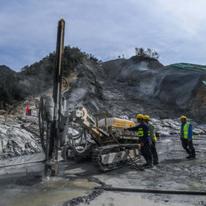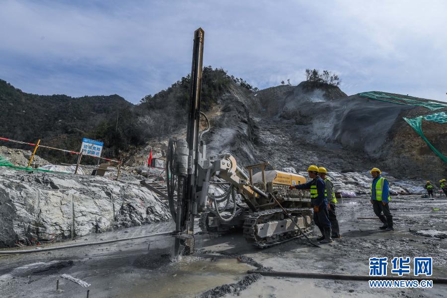 2月22日,在双溪口水库工程现场,工人们在大坝底部进行坝基固结灌浆施工。