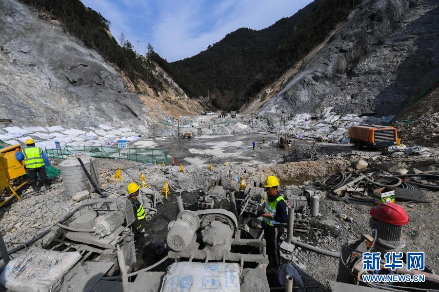 2月22日,在双溪口水库工程现场,工人们在大坝底部进行坝基固结灌浆施工。新华社记者 徐昱 摄