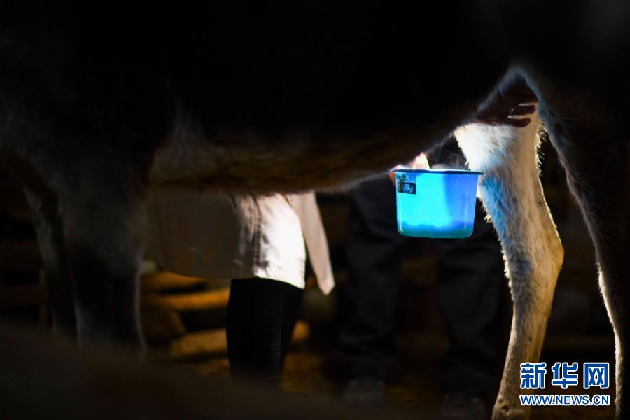 在新疆皮山县阔什塔格镇加依纳古特村,吾拉木·图尼亚孜的爱人布威萨热·阿卜杜杰力在挤驴奶(2月4日摄)。新华社记者 赵戈 摄