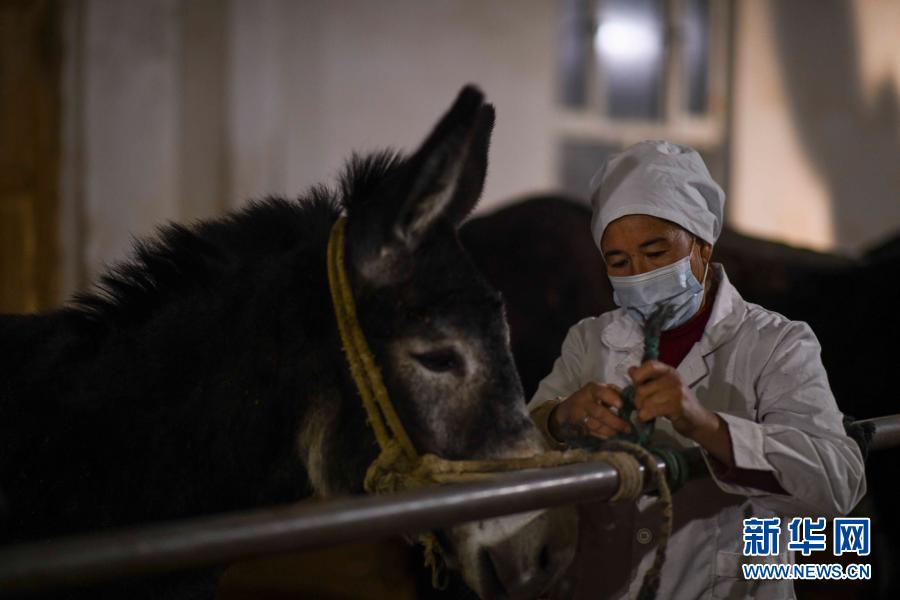 在新疆皮山县阔什塔格镇加依纳古特村,吾拉木·图尼亚孜的爱人布威萨热·阿卜杜杰力将毛驴拴好,准备挤奶(2月4日摄)。新华社记者 赵戈 摄
