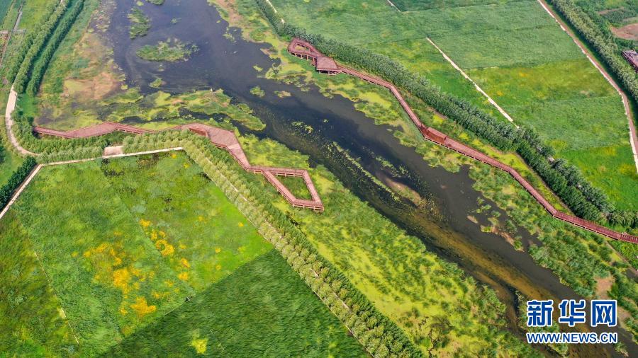 经过辽河流域系统治理和生态修复后形成的四平市西湖湿地公园(2020年8月4日摄,无人机照片)。新华社记者 张楠 摄