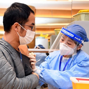 2月22日,在北京市海淀区中关村软件园二期一家企业内的临时接种点,企业员工(前左)签署知情同意书。新华社记者 任超 摄