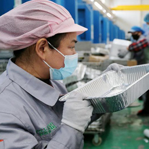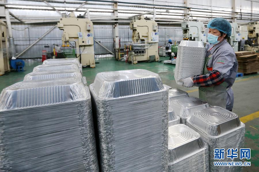 2月22日,在安徽省濉溪经济开发区一家铝制品生产企业的车间内,工人在加工铝箔餐盒。