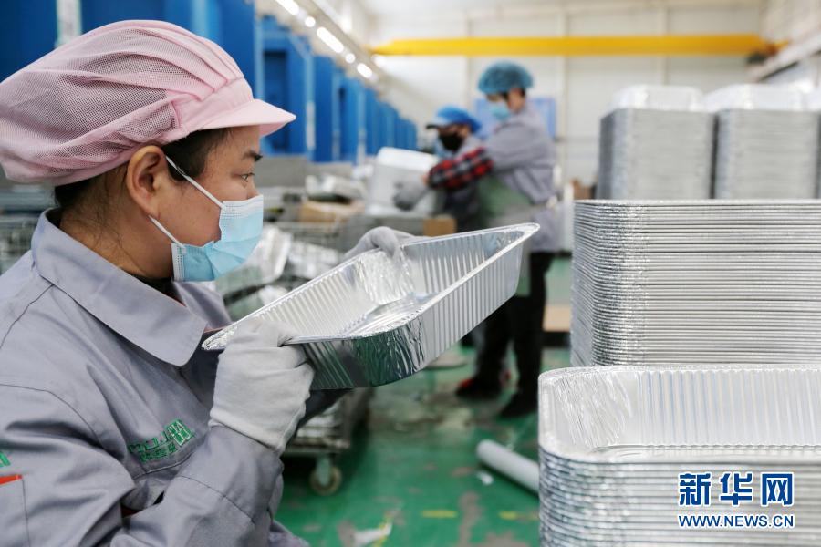 2月22日,在安徽省濉溪经济开发区一家铝制品生产企业的车间内,工人在加工铝箔餐盒。