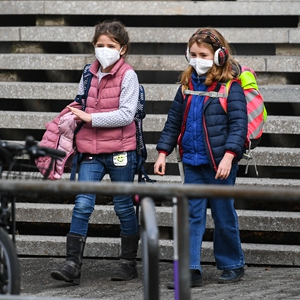 2月22日,在德国法兰克福,两名小学生上完课后离开学校。自当日起,随着新冠防疫措施的逐步宽松,德国部分联邦州的学校和日托中心复课。新华社记者 逯阳 摄