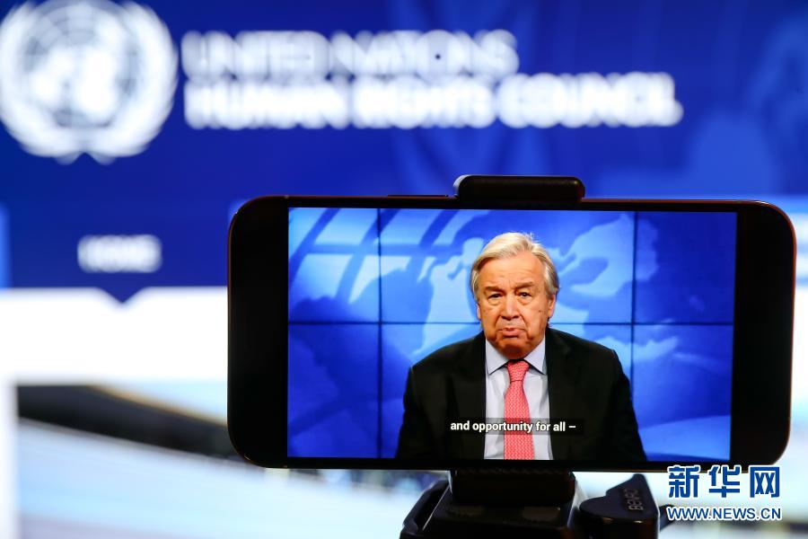 这是2月22日在比利时布鲁塞尔拍摄的联合国秘书长古特雷斯在联合国人权理事会第46届会议高级别会议上致辞的屏幕画面(背景为联合国人权理事会官方网站画面)。