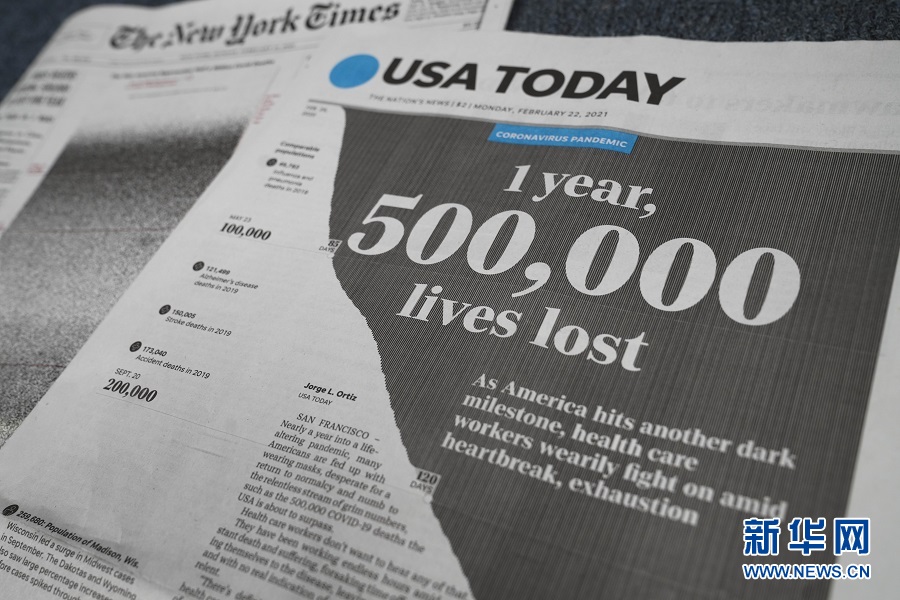2月22日出版的《今日美国》报头版整版报道美国累计新冠死亡病例超过50万例(2月22日摄)。