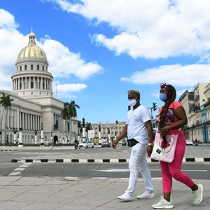 2月22日,在古巴首都哈瓦那,一名警察在一处因出现疫情而限制出入的街区执勤。