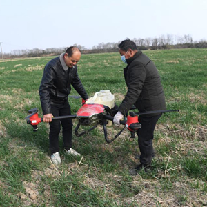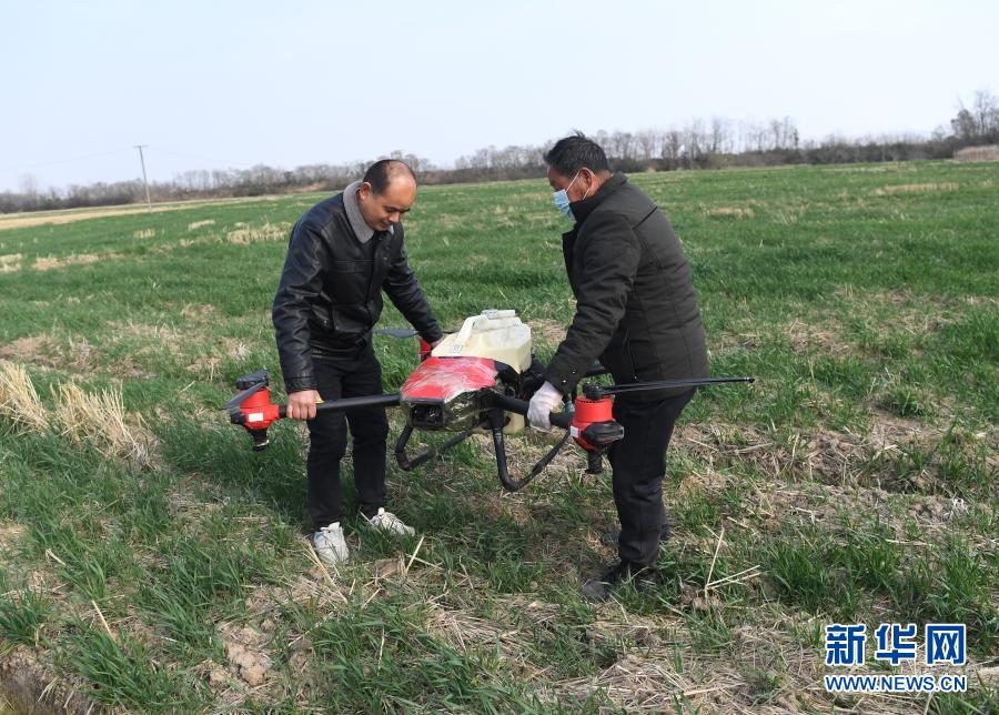 2月23日,合肥市肥西县花岗镇农民准备用植保无人机为小麦喷洒农药。
