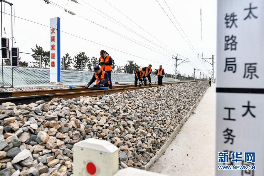 2月23日,中国铁路太原局集团有限公司大同工务段古店工区的工作人员在巡线。